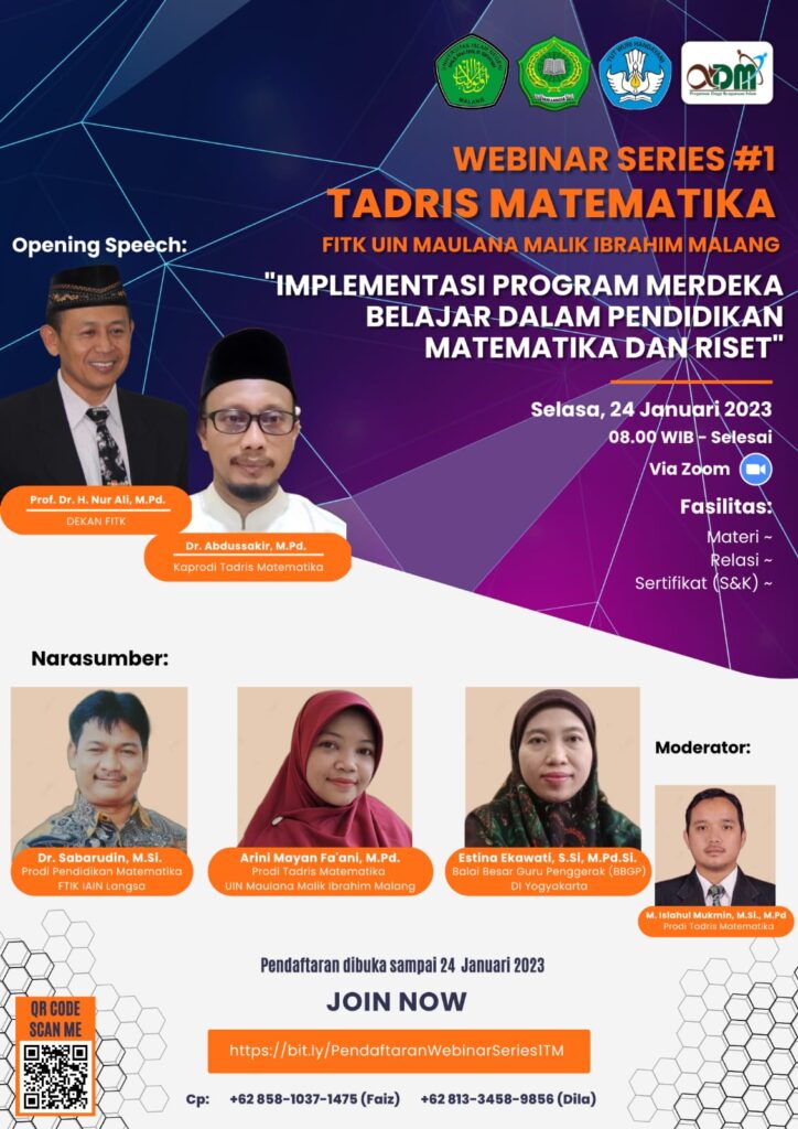 Pada Selasa, 24 Januari 2023, Program Studi Tadris Matematika UIN Maulana Malik Ibrahim Malang menggelar Webinar Series #1 dengan tema “Implementasi Program Merdeka Belajar dalam Pendidikan Matematika dan Riset.” Acara ini diselenggarakan melalui platform Zoom Meeting dan dihadiri oleh mahasiswa Tadris Matematika. Webinar ini bertujuan untuk memberikan pemahaman lebih mendalam tentang bagaimana program Merdeka Belajar dapat diterapkan dalam pendidikan matematika dan bagaimana riset dapat dikembangkan sejalan dengan kebijakan tersebut.