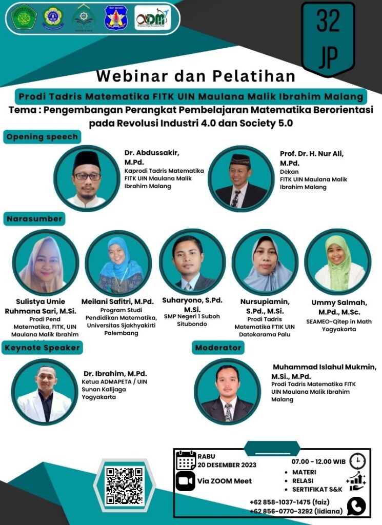 Matematika Program Studi Tadris Matematika UIN Maulana Malik Ibrahim Malang telah menyelenggarakan Webinar dan Pelatihan pada Rabu, 20 Desember 2023 melalui platform Zoom Meeting. Kegiatan ini menghadirkan Dr. Ibrahim, M.Pd., Ketua Asosiasi Dosen Matematika dan Pendidikan Matematika Indonesia (ADMAPETA) sekaligus dosen dari UIN Sunan Kalijaga Yogyakarta, sebagai narasumber utama. Peserta dari kegiatan ini adalah mahasiswa Tadris Matematika UIN Maulana Malik Ibrahi, Malang dan para pendidik di Indonesia yang akan memperoleh pelatihan terkait isu-isu terkini dan keterampilan dalam bidang pendidikan matematika.