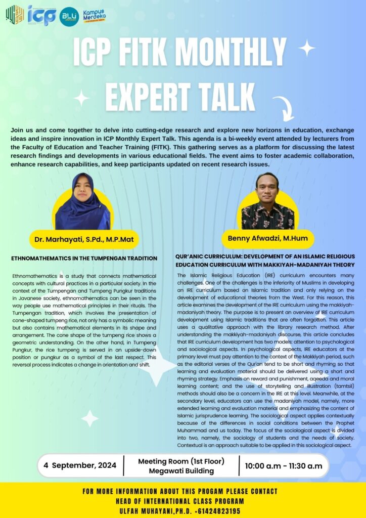 Pada tanggal 4 September 2024, Unit International Class Program (ICP) Fakultas Ilmu Tarbiyah dan Keguruan (FITK) UIN Maulana Malik Ibrahim Malang menggelar acara Expert Talk ICP yang bertajuk “Ethnomathematics in Tumpengan Tradition”. Bertempat di Meeting Room Megawati Lt. 2, acara ini menghadirkan Dr. Marhayati, M.PMat sebagai pembicara utama. Dengan mengangkat topik etnomatematika, kegiatan ini bertujuan untuk memberikan pengalaman berharga bagi dosen dalam mempresentasikan karya ilmiah mereka dalam bahasa Inggris, serta memperkaya wawasan mahasiswa mengenai keterkaitan matematika dengan kebudayaan, khususnya tradisi tumpengan.