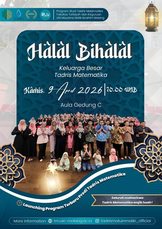 Malang, 9 April 2026 — Program Studi Tadris Matematika UIN Maulana Malik Ibrahim Malang kembali meneguhkan komitmennya sebagai prodi yang adaptif, inovatif, dan berkarakter melalui penyelenggaraan kegiatan Halal Bihalal yang dirangkaikan dengan sosialisasi program unggulan pada Kamis (9/4). Bertempat di Aula Lantai 3 Language Center UIN Maulana Malik Ibrahim Malang, kegiatan ini dimulai pukul 10.00 WIB hingga selesai dan dihadiri oleh seluruh dosen serta mahasiswa dalam suasana penuh kehangatan, refleksi, dan semangat pembaruan.