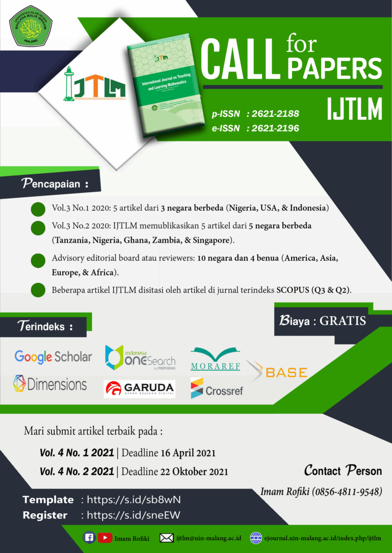 International Journal on Teaching and Learning Mathematics (IJTLM) merupakan jurnal yang diterbitkan oleh Program Studi Pendidikan Matematika Universitas Islam Negeri Maulana Malik Ibrahim Malang. IJTLM diterbitkan dua kali dalam setahun pada bulan Juni dan Desember. Terbitan awal secara elektonik (online) jurnal ini dimulai dari Volume 1, Nomor 1 bulan Juni 2018. IJTLM telah memiliki nomor register p-ISSN : 2621-2188 dan e-ISSN : 2621-2196.